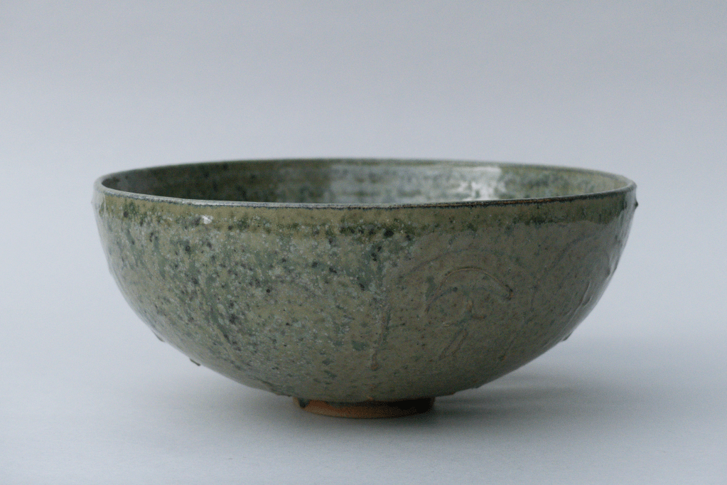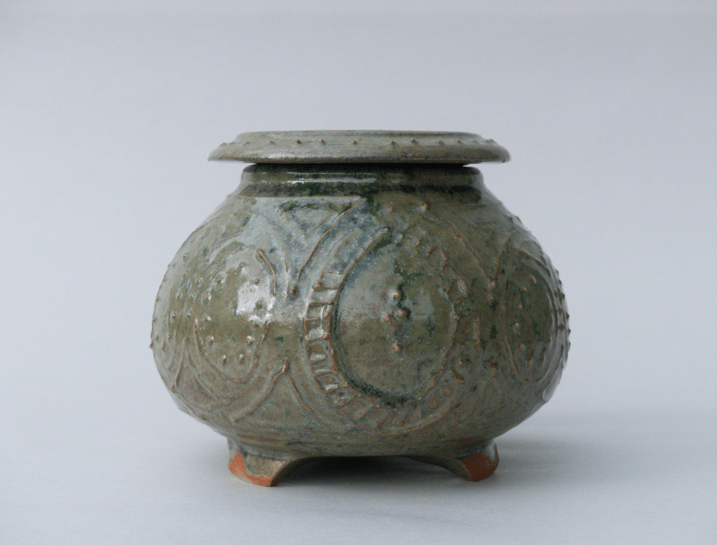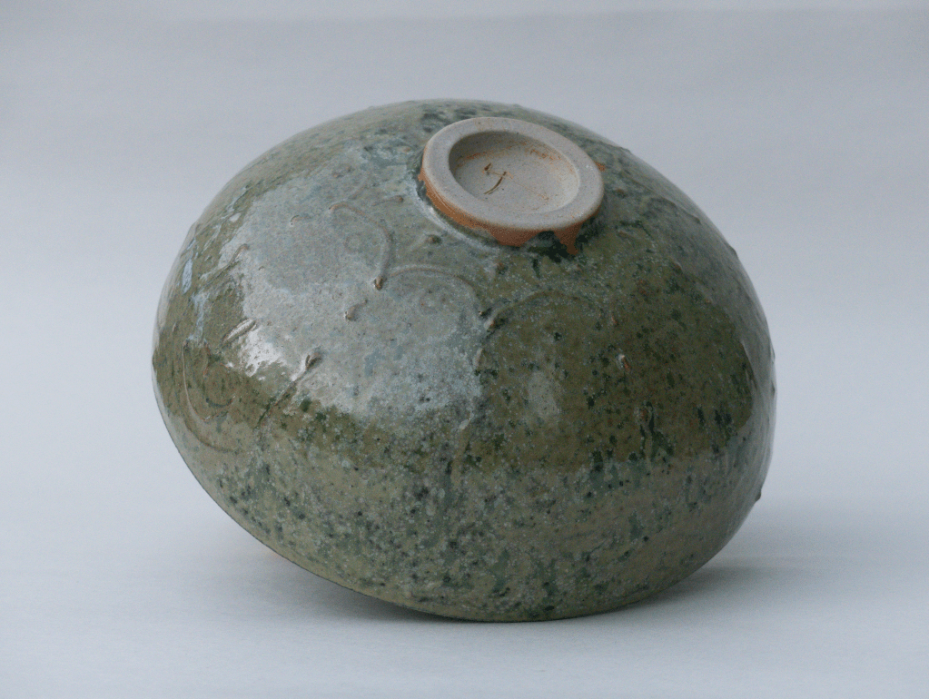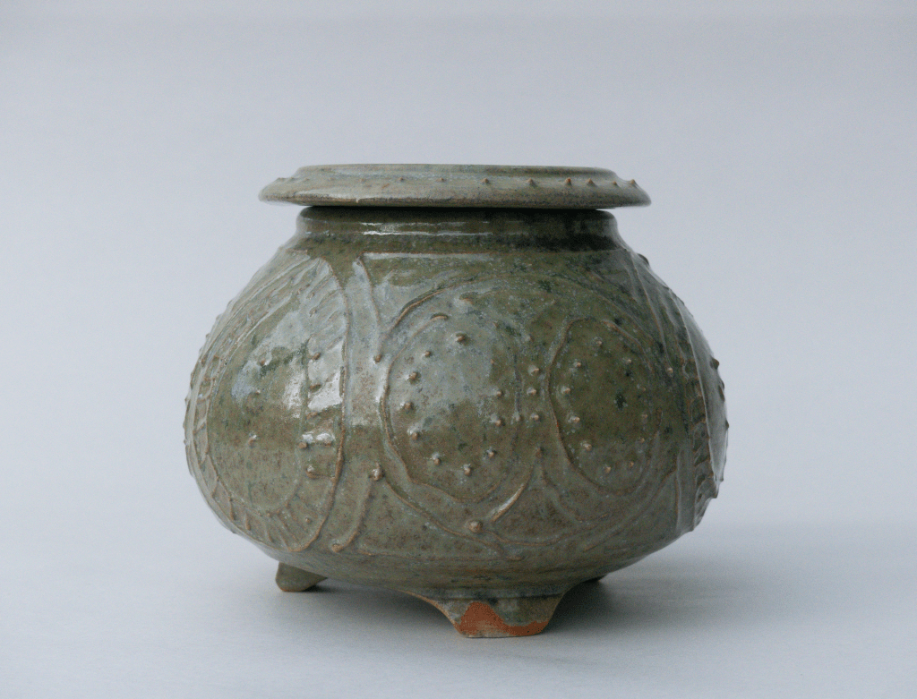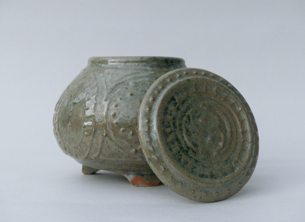 v Bol et boîte émaillés avec la recette à l’émail de cendre de lavande, cuit en réduction. Décor de barbotine à la poire.