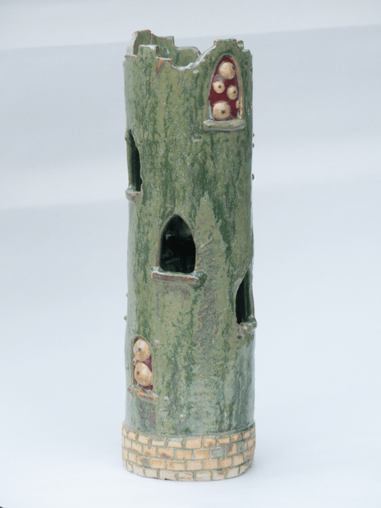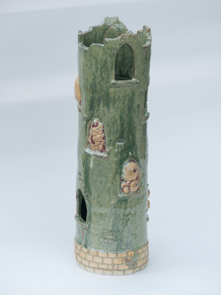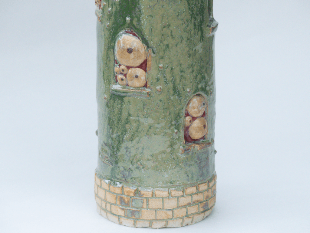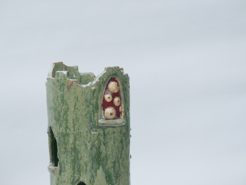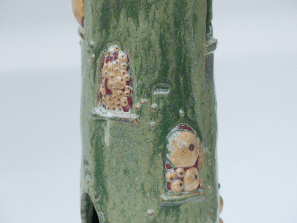 v Sculpture exposée lors du Weekend Céramique de Beuzeville 2026. Principalement de l’émail de cendre de lavande, cuit en oxydation. J’ai pu voir que cette recette est assez stable. Il coule sur lui-même mais ne dépasse pas la zone d’application. Cristalisation ou saturation ?